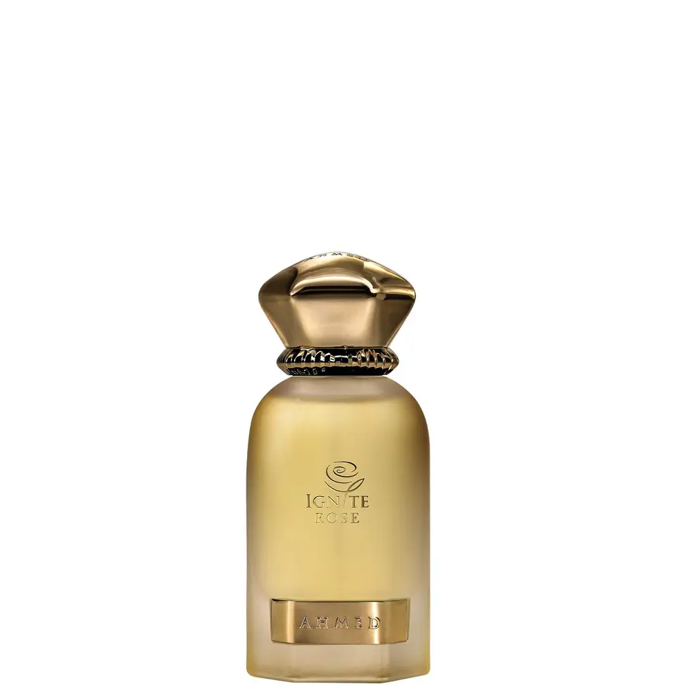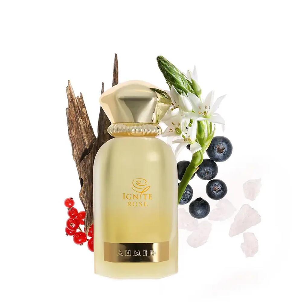 Ignite Rose beginnt mit spritziger Bergamotte, verfeinert durch Safran und strahlende Aldehyde. Süße Mandarine und Pfirsich verleihen saftige Farbtöne, während Praline und Honig einen sanften gourmandischen Schimmer hinzufügen, unterstützt von einem salzigen Hauch aus Algen. Das Herz blüht um Rosen—Bulgarische und Damaszener—begleitet von Orangenblüte; Oud und Vetiver geben Struktur, während Seerose und Frangipani fließende florale Akzente setzen. Die Basis vereint Tonka und Wärme von Zuckerrohr über Amber, weißen Moschus und Eichenmoos, angereichert durch wilde Hölzer und einen sanften Schleier von Vanille.